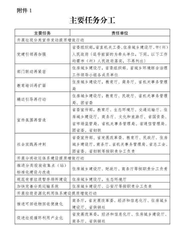 (一)加强组织领导。全省上下要深入贯彻落实习近平总书记关于垃圾分类工作的系列重要论述精神,增强工作的自觉性和坚定性,认清肩负的光荣使命和艰巨任务,协同发力、精准施策、久久为功,以实际行动践行“两个维护”。建立健全省级生活垃圾分类工作协调机制,加强工作统筹协调,做好日常组织协调、监督管理和指导考核等。省直相关部门按照职责分工做好生活垃圾分类相关工作,及时研究解决推进生活垃圾分类工作中遇到的困难和问题。各城市人民政府是生活垃圾分类工作的责任主体和实施主体,要健全工作推进机制,加大要素保障力度,加快建立分类投放、分类收集、分类运输、分类处理的生活垃圾管理系统,实现生活垃圾分类制度全覆盖。
